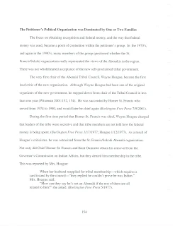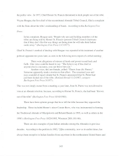 From 1974 to the present, petitioner's organizational politics has been dominated by one or two families struggling for control. For the most part, the St. Francis family has controlled the organization. Mrs. Hoague charged in 1977 that Homer St. Francis was elected "tribal chairman" in an election that was not widely publicized to Abenaki members. She said, "St. Francis was elected tribal chairman by the St. Francises, who were the only ones informed of the meeting" (Burlington Free Press 5/1977). Wayne Hoague also complained that several people were named to positions of authority to represent the Abenaki Tribal Council without ever being voted on by the membership (Hoague 1/12/ 1977). Similar instances of control by one family have weighed against federal recognition under this criterion (BIA MaChris Lower Alabama Creek Indian Tribe 1987:4, 2)6).